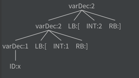 特别提醒 :在语法树中,ID 与数组维度的结合顺序与实际声明顺序是相反的 。例如,int x[1][2] 在语法树中 ID 是先绑定维度 1,再绑定维度 2。因此,在使用递归等方法解析数组定义时,务必注意这种顺序差异,避免将数组维度颠倒,导致类型构建错误。